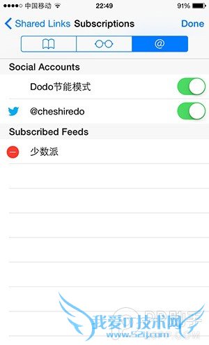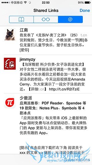 简单说来 Shared Links 是一个订阅器,但需要注意的是这里的订阅内容仅仅只是链接而已,即每条订阅内容都是一个链接,点开则进入相应网页。可订阅的对象分为两类:一类是社交网络中带有链接的 post,如你关注的某人在微博分享了一个视频链接,那么这条微博便会出现在 Shared Links 中,反之如果是一条纯文字微博则不会被收集进去;另一类是网站,以少数派为例,将网站首页添加进 Shared Links 后便可以不用点开网站来查看更新了。再退一步更加简要说来,Shared Links 可以看作是一个只显示摘要的 RSS 订阅器,你通过查看摘要来决定要不要点进链接,某种程度上也是 RSS 初衷。