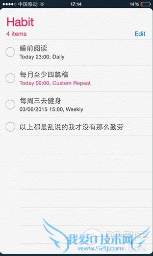 当然它并不是完美的,首先一点便是 Reminders 没有统计数据,仅仅有完成纪录(虽然对于习惯养成来说统计数据到底重不重要且是个问题)。另一方面在 iOS 最近的更新中 Reminders 似乎有了些细微的变化,首当其冲的便是不定日期的次数循环设置消失了,因此现在无法再设置「每个月至少四篇稿」这一类不定日期只定次数的习惯。