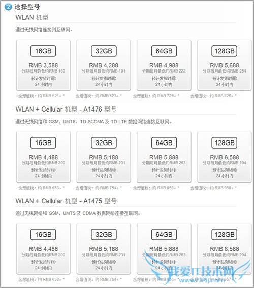目前iPad Air和iPad mini 2各有3个版本机型和不同容量供选择