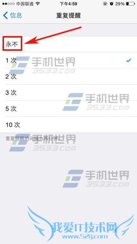 2)打开信息后我们再点击最下方的【重复提醒】,打开后把默认重复提醒一次的改为【永不】就可以了,下次再来信息的时候就只提示一次的了。(如下图)