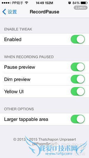 此外用户还可以选择在暂停时,使上方的时间变成黄色,与拍摄状态进行区分。有需要的用户可以从Cydia当中免费下载使用插件,插件仅支持iOS8系统。