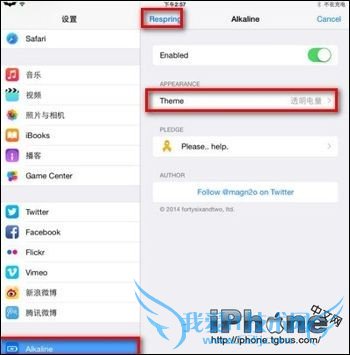 8、上传完毕大家就可以立即在设置——Alkaline——Theme当中查看了,选中你所要更换的电池图标种类(如图二所示),返回上一级菜单,点下图当中的——Respring,重启设备新的图标就会生效了。