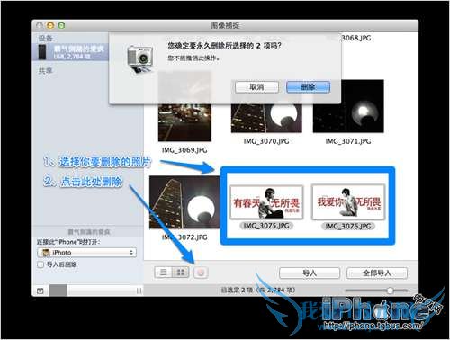 使用ImageCapture来删除iPhone中的照片,只需要简单的三步,选择,删除,确认。比起iPhoto,实在是方便多了 。