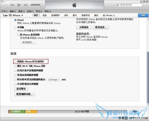 第二步,在打开的设备摘要页面中,拖到最下面,将连接此 iPhone 时自动同步选项关闭,并单击右下角的“应用”按钮,即可。