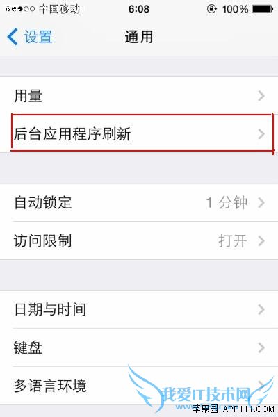 第一步,在“设置”应用中,“通用”选项页面,点击进入“后台应用程序刷新”。