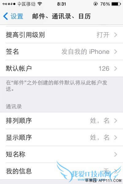 第二步,在“邮件、通讯录、日历”选项页面,点击进入“默认帐户”,这里需要说明一下,只有在添加两个及两个以上的邮箱地址时,才会出现“默认帐户”选项。