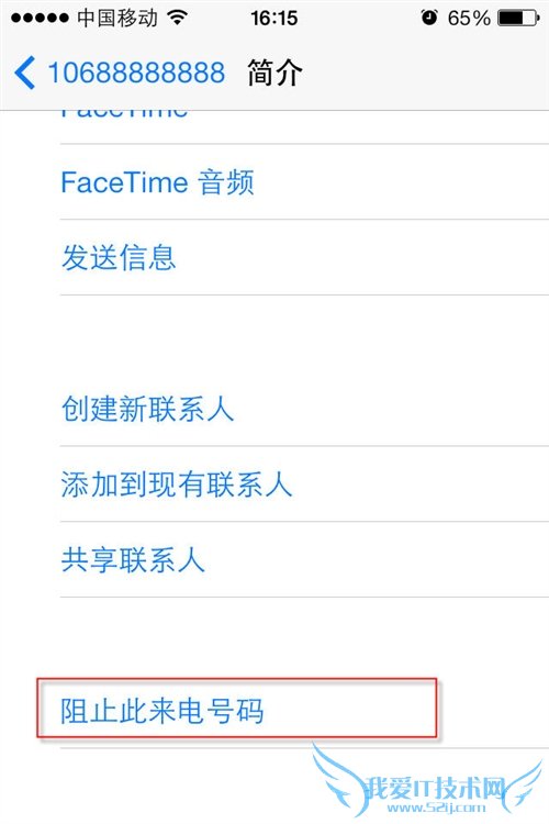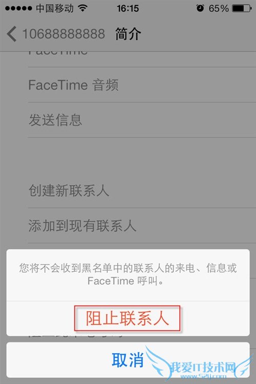 第四步:最后在弹出的确认框中,确认阻止该号码。此后,即不会再收到该号码的来电、信息或是FaceTime呼叫。