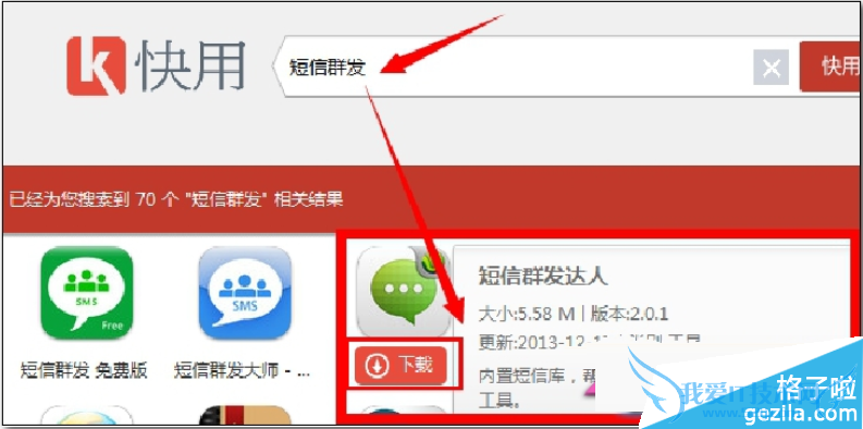 1:将手机与电脑连接,打开快用苹果助手,在搜索框中输入“短信群发”,然后在搜索结果中找到“短信群发达人”,在图标底下选择“下载”,如图所示: