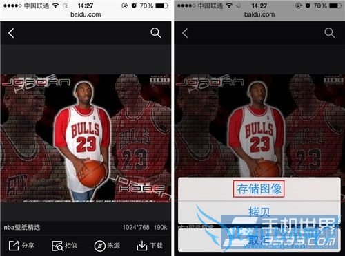 2)找到自己喜欢的图片后,长按该图片,这时系统会弹出一个菜单,在菜单选项中选择【储存图像】就可以保存该图片至相册了。