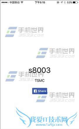 4)最后打开应用,就可以看到你的iPhone6sPlus的处理器是哪家代工的,比如大猫的这部,显示【S8003 TSMC】,证明就是台积电代工的处理器。