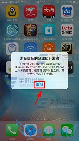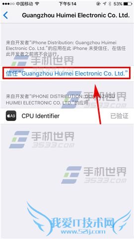 3)找到并点击【Guangzhou Huimei Elec。..】,然后点击【信任】,用完之后点击【删除应用】即可。(PS:打开应用后就可以看到你的iPhone6sPlus的处理器是哪家代工的)(如下图)