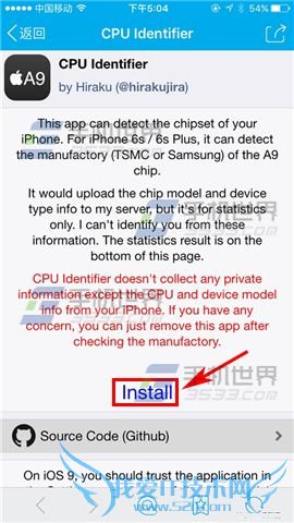 1)打开【Safari浏览器】,输入http://demo。hiraku。tw/CPUIdentifier/进入,接着点击【Install】,再点击【安装】。(如下图)