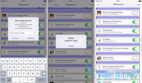 在这个应用里,你可以点击左上角的“+”来增加新的源,大致方法和Cydia里的一样。添加源后,该源就会出现在源的列表中。