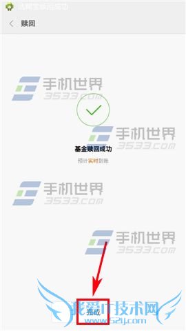 2)接着输入支付密码,点击【确定】,即可赎回成功,点击【完成】跳转回首页。(如下图)