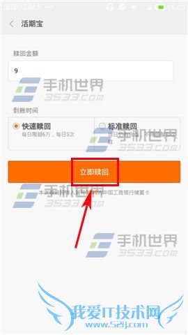 1)打开小米金融,进入首页后,在活期宝一项中,点击【赎回】按钮,输入想要提现的金额,选择一种到账时间,“快速赎回”呢则可以实时到账,但有显示,每天只能快速赎回三次;“标准赎回”呢,则需要等到第二天才能到账,在当天还仍有收益的,并且不限次数。选择好你要到账的方式后,点击【立即赎回】。(如下图)