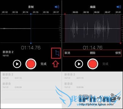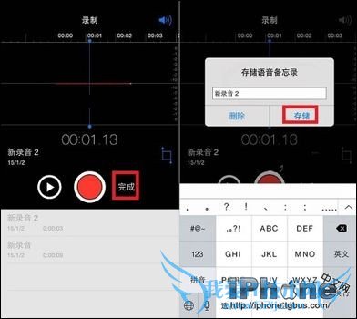 4、另外在暂停状态下,我们点击小红圈后面的【完成】就可以保存iPhone6的录音,并且我们还可以为这段录音命名,完成后,点击【存储】即可完成保存,如下图所示。
