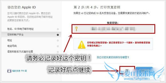 14、此时会显示“恢复密钥”,这一段字符串需要你安全保存,保存无误后点击继续;