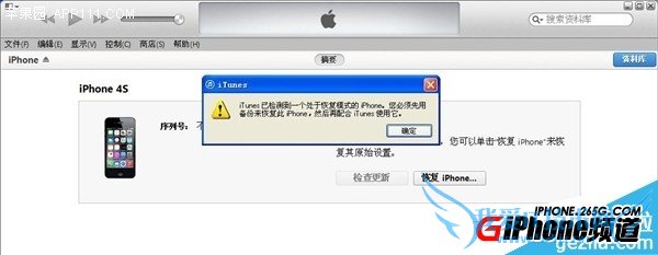 2、iTunes 会自动检测到一台等待恢复的设备,点击确定。