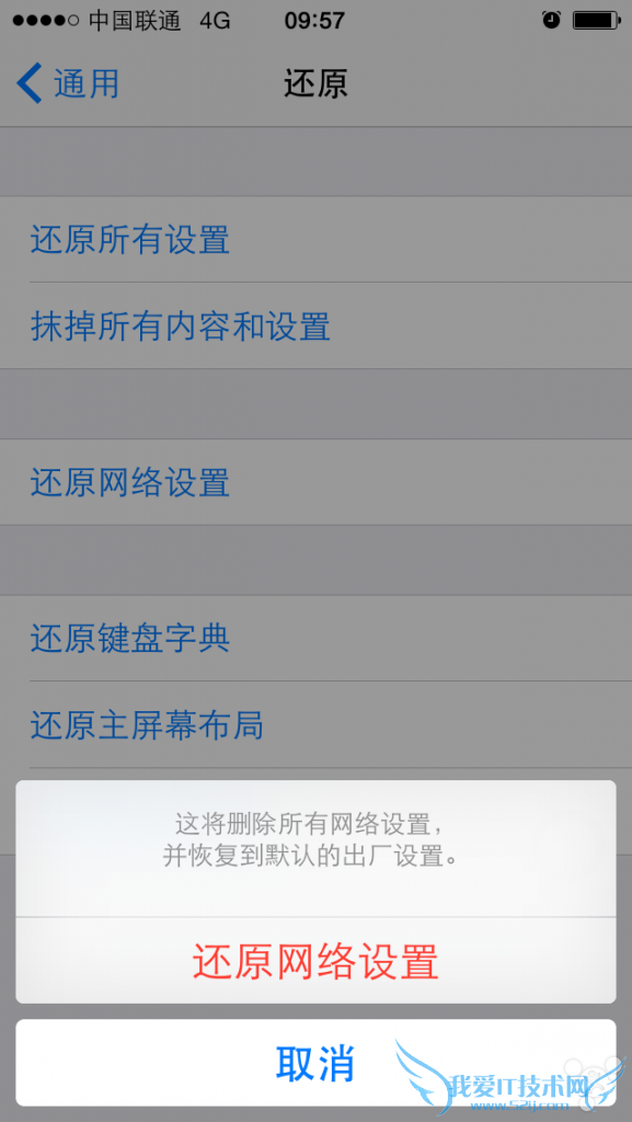 第四步:进入设置--通用--还原,选择还原网络设置,然后手机会自动重启。