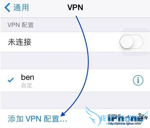 4、在 VPN 的设置界面里点击“添加 VPN 配置”一栏,如图所示
