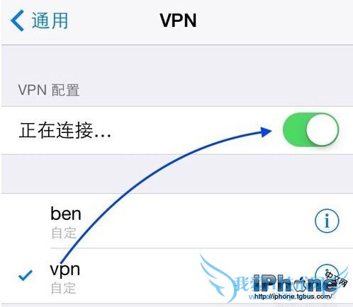 7、随后选择刚刚配置的 VPN 连接,再点击连接开关,进行 VPN 的网络连接。