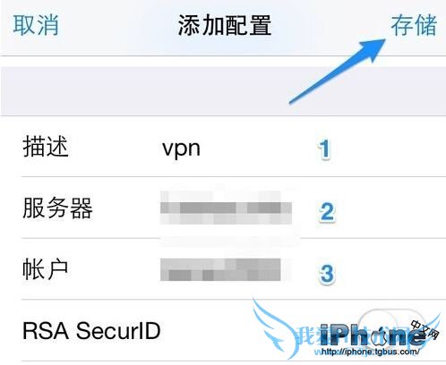 6、我这里以 PPTP 类型为例,依次输入如下图标识的描述,服务器,帐户和密码,然后点击“存储”按钮。