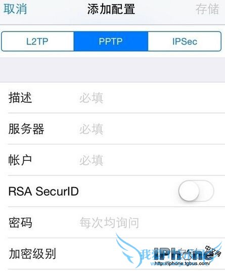 5、VPN 有三种类型,分别为 L2TP、PPTP 和 IPSec 三种。根据你自己当前的 VPN 账户的类型来设置。