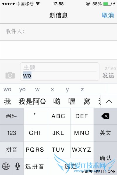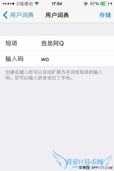 在用户词典栏目中可以点击“添加新的短语”,这里以“我是阿Q”为短语,“wo”为输入码,保存短语后。在输入“wo”时即可显示候选项“我是阿Q”。