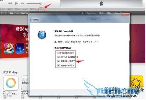 5、运行iTunes内部诊断。点开帮助,点击诊断。