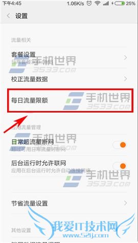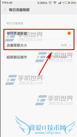 2)选择【每日流量限额】,进入后开启【每日流量限额】右边开关,你可以点击【流量限额大小】设置流量使用大小。(如下图)