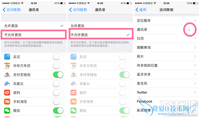 3、将【不允许更改】激活,返回访问限制可见【通讯录】加锁即可。