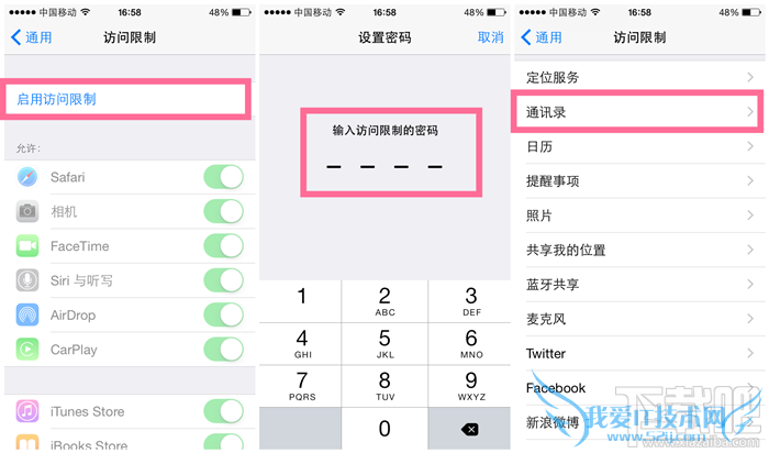 2、点击【启用访问限制】,输入访问限制密码后,选择【通讯录】。