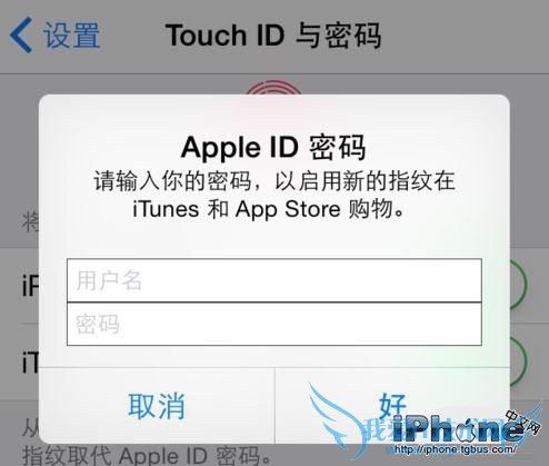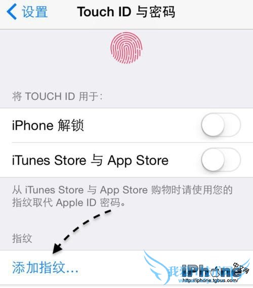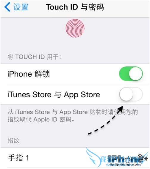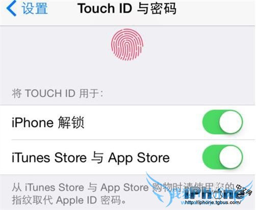 13、随后即可看到“iPhone解锁”选项已经启动,可以用指纹来解锁了。此时我们还可以点击打开“iTunes Store与App Store”选项,它可以用指纹购买下载应用软件。