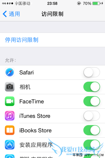 第三步,进入访问限制页面,在允许选项中选择关闭需要限制的系统应用,如Safari、相机等,即可实现该应用的隐藏。