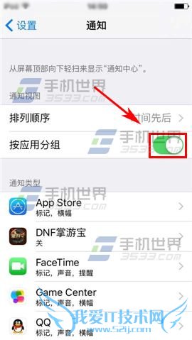 点击设置进入,然后点击【通知】一栏,再开启【按应用分组】右边滑块即可。(如下图)