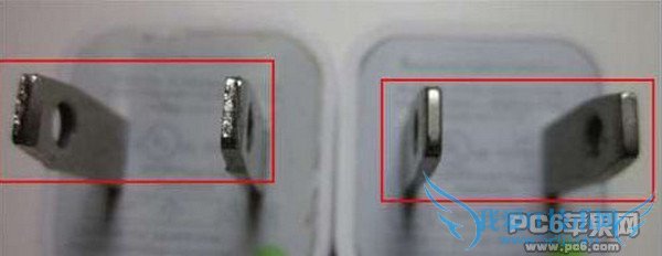 鉴别苹果原装充电头也有一个非常简单省时的方法,只需要两个步骤,一是看电源插脚,苹果是一家十分重视工业设计的公司,其电源适配器自然也不例外,苹果原装的充电头的插脚是圆润光滑的,而假货则必然坑坑洼洼。