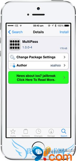 1. 首先你的设备必须是已越狱的 (查看越狱教程),先开启 Cydia,在底部选【搜索】,然后在搜索框中输入MultiPass 。