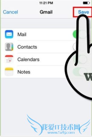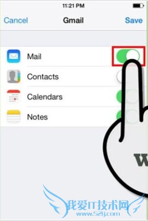 3、选择你想要在iPhone上启用的Gmail功能。你可以选择同步邮件、联系人、日程表和注释等内容,然后这些内容就可以通过Google账号导入你的设备中。