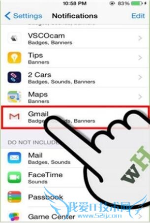 4、在iPhone设置中改变推送通知设置。进入“设置” → “通知中心”(iOS8里是“通知”),启用通知。点击程序列表中的Gmail,可以允许Gmail推送横幅、声音、顶部等处的通知信息,具体开启哪些位置的通知,看你个人的喜好。