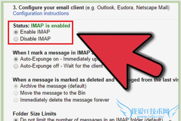 - 检查“IMAP访问”区中的“状态:”,如果显示的不是“IMAP 已启用”,则点击“启用IMAP”的选项。