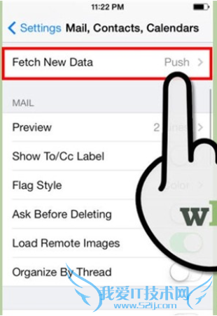 7、修改推送设定。在“邮件、联系人和日历”中选择“获取新数据”,决定邮件的更新频率。打开“推送功能”,它就会自动更新和接收邮件。关闭了的话,你需要选择邮件更新的频率。建议关闭推送功能,或者选择手动查收邮件,这样有助于延长电池使用寿命。