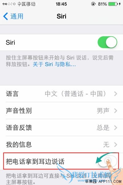 第二步,在Siri的设置项中,关闭“把电话拿到耳边说话”选项功能。