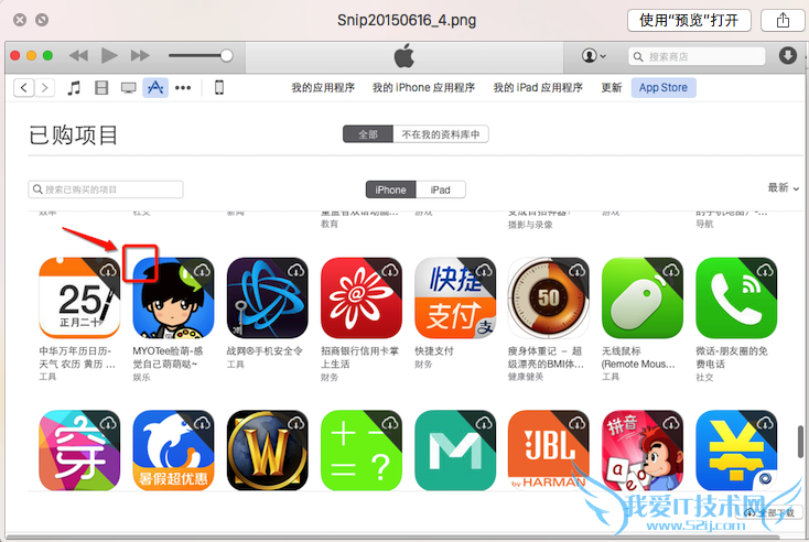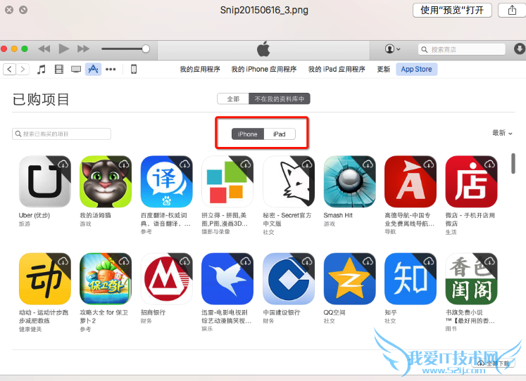 3、接下来就会看到所有在iPhone和iPad上购买的项目,点击“iPhone或iPad ”可以更改显示顺序,如图所示。