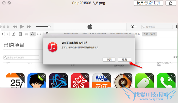 5、选择“隐藏”, 那样在你的苹果手机appstore上面“已购项目”就会清除了。