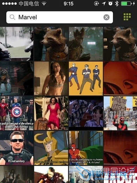 这可能还不够吸引你。那么内置的搜索功能又如何?从此互联网上的海量 GIF 动图都能收入掌中。来看看我搜索「Marvel」的结果,够给力吧?