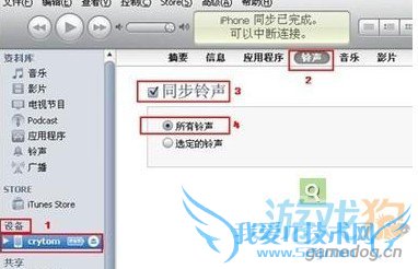 10.然后在“设备”里打开“iphone”选择“铃声”,在“同步铃声”项打钩,选择“所有铃声”,或者“选定铃声”,然后选择“同步”,即可