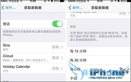 3、向下滑动菜单来设置让iPhone检查一次新邮件的时间,目前的IOS系统提供了每15分钟、每30分钟、每小时和手动。
