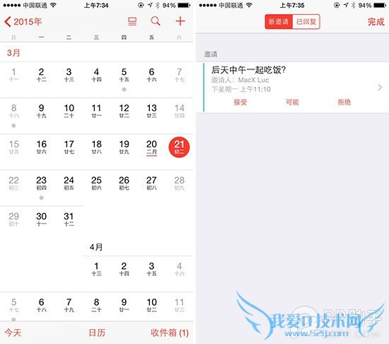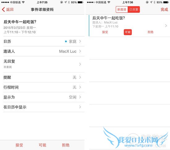 被邀请人很快就会受到通知,提醒有朋友邀请自己参加未来的某个事件。 进入iOS8日历后,我们可以看到朋友创建的事件会自动添加至日历中,上图中就是3月23日的小圆点。这时,右下角的“收件箱”内会变成1,提醒用户有人邀请自己参与某个事件。进入后,可以在“新邀请”界面下查看事件详情,包括事件主题,邀请人、时间等。我们可以点击接受、可能或拒绝处理事件,无论选择哪种回答,邀请发起人可以在日历中查看被邀请人的回应。