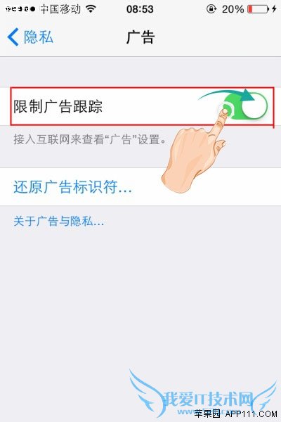 第三步,在“广告”设置页面,开启“限制广告跟踪”功能,即可。