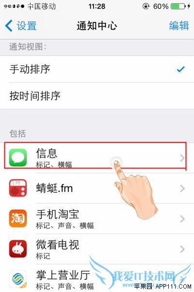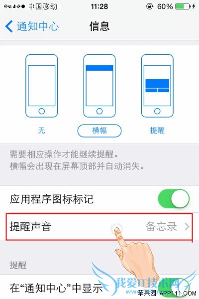 第三步,点击进入某个应用程序(例如信息),就可以进行“提醒声音”、“在通知中心显示”、“在锁屏上显示”等设置。